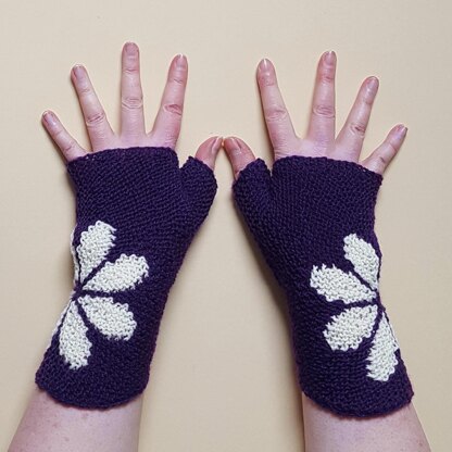 These fingerless gloves are knitted flat and in garter stitch. They are shaped with short rows around a point at the outer wrist, the thumb is created one half at a time (with a short knitted CO and a BO). The flower pattern is done in intarsia technique. The project starts with a provisional cast on and finishes with grafting in garter stitch. In the end the side seams are sewn up. Since this is an intarsia project with three colours that also uses short rows, it can be quite fiddly. It is NOT a beginner pattern.