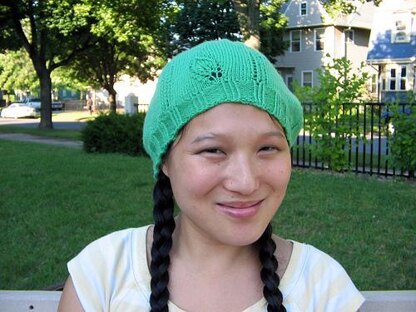 This moderately slouchy beret features a delicate leaf motif above the brim. May is knit in a fingering weight washable wool yarn and features eyelet lace that continues into the crown decreases. Charts and written instructions are included for the leaf motif and lace eyelets. The hat is worked in a bouncy wool with great stitch definition. This pattern is appropriate for an advanced beginner.