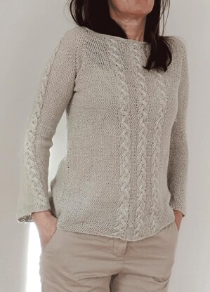 maya shanti is a raglan with boat neckline with cables on front, back and sleeves. The sweater is worked in reverse stockinette stitch, cables in stockinette. Some of my testers turned work and knitted the hole sweater, purling the cables.