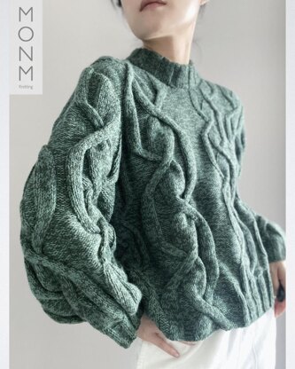 Maze pullover is an oversized knitwear that designed with unpredictable cable patterns. Each size has its own unique cable combination. Garment features large-small cable pattern, fold-down crew collar and wide asymmetrical ribbing body trim. Pullover is worked from top down in one piece.