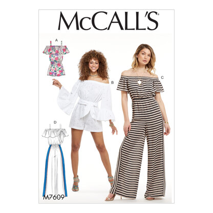 McCall's Misses' Pull-On Off-the-Shoulder Rompers and Jumpsuits with Elastic Waist and Sash M7609 - Sewing Pattern is a Beginner Sewing pattern by McCall's, available as a Paper Pattern and includes instructions in English, Spanish. Super fun to make, this pattern could be your next masterpiece!