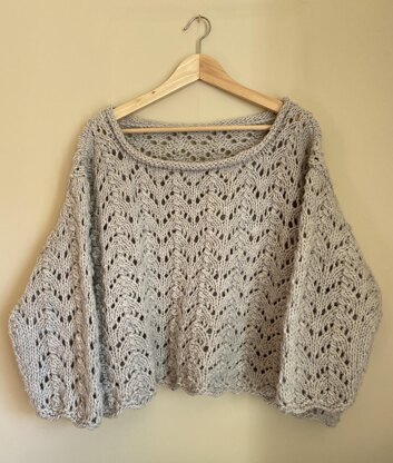 A chunky weight loose fitting jumper, lovely for those cooler spring/summer days, pop on over a summer dress, or wear with jeans. It's knitted in an easy all over lace pattern with a wide boat neck, modified drop shoulder and three quarter length sleeves. The body is knitted in one piece, then the sleeves are knitted separately and sewn on. To fit from 32", 40", 48" 56" 64". Finished bust measurements - 44", 52", 60", 68", 76"/ 112cm, 132cm, 152cm, 173cm, 193cm. Designed to be worn with 6"- 12" of positive ease. Yarn - Chunky weight - needs 460m, 600m, 740m, 910m, 1060m / 503yd, 656yd, 798yd, 995yd, 1159yd. Sample knitted in 3rd size and took 4 skeins of Brooklyn Tweed Quarry
