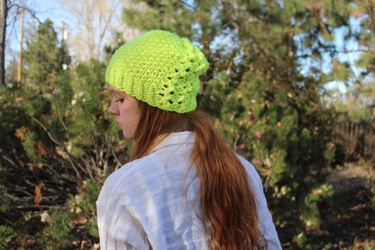 Mega Tower has simple lace running up one side with all around seed stitch. Knit entirely in the round, you can have this done in an evening. This is designed for super bulky yarn, but you can double bulky, or use 4 strands of worsted or aran yarn.