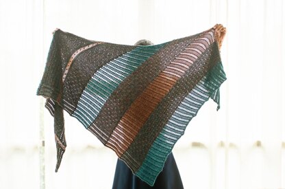 This is an asymmetric wrap worked in one piece with some pretty motifs, nupps and lace. The wrap uses yarns of different weights held together in sections as well as single strand sections, creating a lovely texture throughout the shawl.