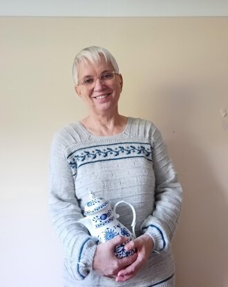 The “Meissen Sweater” was inspired by the beautifully shaped and painted ornate designs of Meissen porcelain from my native Germany. This sweater is light and airy, and I added textured ribbing and lace details to copy the filigree edging of the porcelain pieces. The “Tulip lace design” which trails along the sides and sleeve centres was first used in traditional German sock knitting in the early 19th Century and mimics the textured China. The sweater has 10cm positive ease, and after completion of the shoulder saddles the body is knitted from the top down. I recommend this knit to advanced knitters.