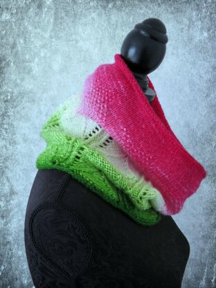This cowl is a versatile knit that you can choose to make in only one colour, or a combination of colours. I used a gradient yarn in the prototype. but a solid or semi solid would also be lovely, & 2 colours also work effectively together, as you will be able to see from the photos.