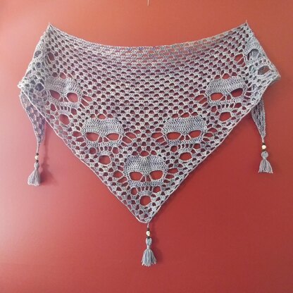 This triangle shawl is worked bottom up, revealing skulls along the outer edges. The detail of the skulls shows best in a solid or tonal yarn. Add fringe or tassels for a little something extra. Directions are given for a DK weight yarn, but this pattern is easily adjustable to make in any weight, larger or smaller. Have fun with it and make it your own!