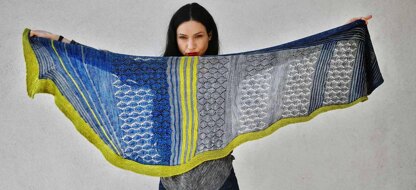 Both the “organic symmetry” found in nature, as well as the decorative shaping used in Art Nouveau architecture inspired the form for this Shawl. The obviously related parts of a whole are celebrated in their individuality, without having them follow any rules for perfect symmetry. Each section completes and complements the next to produce a balanced “whole”, where 3 colours and 2 yarn bases render proportion in varying and almost unexpected positioning and repetitions.