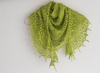 This is a quick-knit top down triangular wrap with alternating bands of stockinette and eyelet rows till the lace border. The wrap is then bound off with a delicate picot edging. This pattern is written for a one skein wrap but the lace section can be repeated a few more times to give you a larger shawl. The lace patterns are both charted as well as written out.