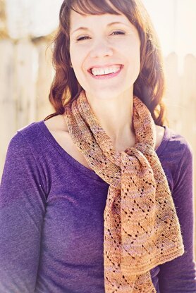 A provisional cast-on is used so the ends are worked out from the neck ribbing. The lace pattern is easily memorized, and with WS rows being 'rest' rows - this scarf would make a great first lace project.