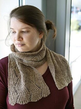 This light, soft scarf transitions across several seasons when beautiful days are cooler, but not cold enough for an outerwear layer. Wear long and loose indoors with a sweater or blouse and double it up when stepping outside into the wind—this piece features a reversible openwork pattern that makes styling a cinch. The back and forth movement of the motif creates a wavy effect that plays well with streaky natural shades or hand-dyed color ways. Simple stitchwork makes this a highly portable, easy to work project for lace newbies and one that experienced knitters will enjoy it as a fun option for travel or gift knitting.