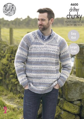 Mens Sweaters in King Cole Drifter Chunky - 4600 - Downloadable PDF is a Intermediate Knitting pattern by King Cole, available as a Downloadable PDF and includes instructions in English. Super fun to make, this pattern could be your next masterpiece!