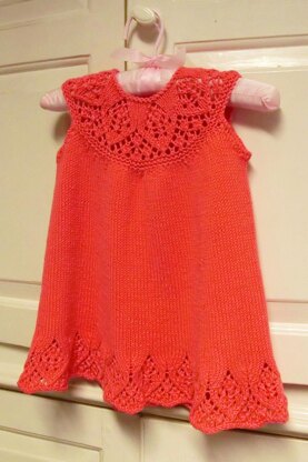 Knitting Pattern for a cute baby and child's dress with lace on yoke and hem. This baby dress was originally published in Let's Knit (UK) as 'Meredith Baby Dress'. The knitting pattern is graded to fit little girls from 9 months up to 7 years.