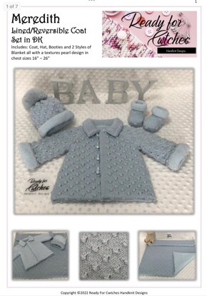 Unisex design consisting of a coat, hat, booties and 2 styles of blanket all lined with an alternating pearls textured effect. Pearls are made by wrapping yarn around stitches. Lining can be knitted in a contrast colour or with a fluffy dk yarn. Using press studs to fasten the coat allows it to be reversible and all accessories are also rever