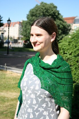 This looks like a shallow triangle shawl. But the construction is different from the traditional triangle. This one is worked from the middle to the side, the boarder is worked as you go. While knitting you also drop a few stitches, but on purpose! These lines will later be used to add the embroidery that let the body of the shawl pop.