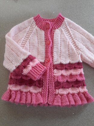 Mermaid baby cardigan, age 0-6 months, 16-18" chest. Actual measurements - chest 18", length 11", sleeve 6" Knitted in one piece with frilled edging and fish scales pattern
