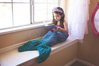 This is a pattern for a fun Mermaid Tail Blanket The fin is a pocket for the feet, and the top is a blanket that can be wrapped around the legs. The pattern comes in three basic sizes: toddler, child, and adult. The sizes are very broad because it is a blanket pattern.