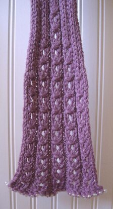 The gentle flare and the pattern of textured openwork “bubbles” remind me of a Mermaid’s tail on this bulky ribbed scarf. Add metallic thread and beads for a little glitz.
