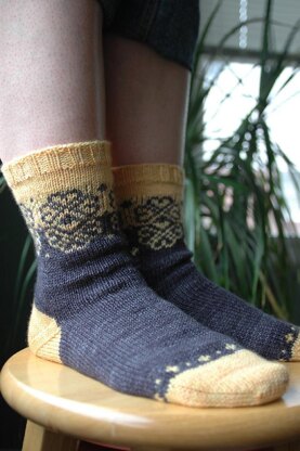 Merripog means "happy kiss," because these socks have just enough of a happy kiss of colorwork to keep things interesting. I designed these socks as I was practicing my two-handed color knitting and wanted to be able to take breaks between the color changes. The cuff starts with a contrast color, adds the main color in a flowery pattern, then transitions to all main color until time to park a line of scrap yarn in place for the afterthought heel. Then the main color carries on until just before the toe decrease, when you play with the two colors a bit more before changing back to all contrast color for the toe. The heel is added in the contrast color at the end--and it's worked just as the toe is worked. Easy!
