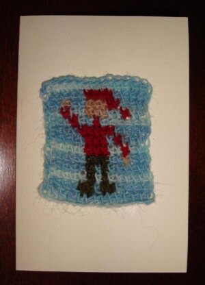I used left-over yarn in assorted colours to make small pictures measuring 14x14 sts, glued them on folded blank cards and wrote greetings inside.
