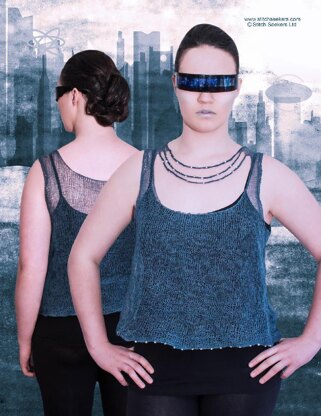 Many futuristic or science fiction fashions show designs with a metallic look, where the jewellery and the clothing are integrated. I was inspired to design a top which represents the intersection of garment and necklace. In keeping with the metallic theme, I chose a stainless steel yarn; as an alternative, a silk or silk-blend yarn will also provide the intended metallic sheen. It can be worn back-to-front, for a demure simple front and a dramatic back view. Two tops for the price of one!