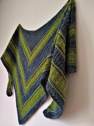 Mettle is an elongated triangular shawl featuring several different but related textures. It is knit top-down from the center, beginning with a provisional garter tab cast on and is shaped by four increases every RS row and two increases every WS row.