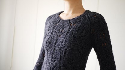 Middleground is a pullover designed to be feminine but not too feminine. It has a subtle overall lace pattern that adds just enough visual interest without being overly lacy. It is worked from the bottom up in pieces: the body is worked in the round up to the armholes; the sleeves are worked flat. This pattern can also be made plainer by working entirely in stockinette stitch, it will then become your blank canvas limited only by your imagination.