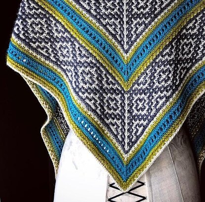 Midnight in Spring is a generously sized, elongated triangular shawl, knit flat, from the top down. Its gorgeous mosaic pattern is surprisingly simple to knit, using just one color per row to create stunning results.