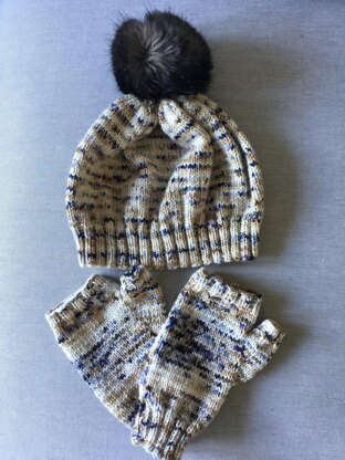 This matching hat and fingerless mitten set can be made from one skein of Dyebath Superwash Merino DK. It is important to match the tension stated otherwise you may need to buy another skein. The hat is worked in the round, with a simple k2, p2 rib section, followed by Stocking Stitch. The mittens are worked back and forth.