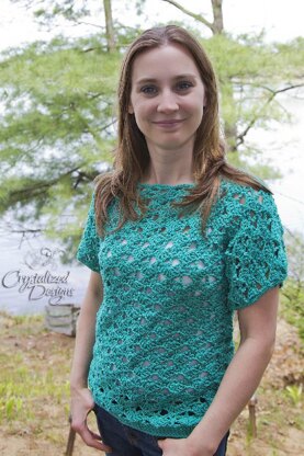 Love lacy tops? This tee is perfect for you! This top is for those who loved the [Midsummer Pullover][1] but wanted the more traditional tee. Though perfect for those warmer months with a cami or bathing suit under, this top can be worn with a tight-fitting long sleeve as well. Pattern includes instructions for a three quarters sleeve pullover and a short sleeve pullover. Also included in the directions is how to make an elastic waist band perfect for a hip hugging garment that won’t stretch out over time!
