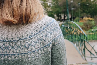 Migla is a top-down seamless yoke sweater. It has short rows at the back of the neck, and a yoke pattern that reflects the shifting shadows of misty forests, with a fading colour inversion. There is optional waist and hip shaping to add feminine shape, and the bottom hem and cuffs are finished off with small elements of the yoke design.