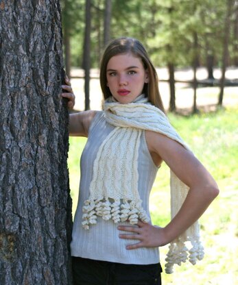 An all-over cable design finished on the ends with Corkscrew tassels. Not too challenging, but looks more difficult than it really is. Knitting cables on the first 8 stitches and the last 8 stitches of the scarf creates interesting edges.