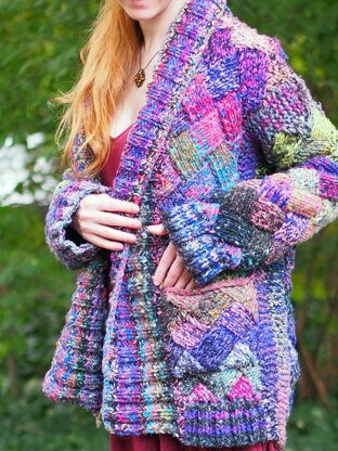 Embrace in a celebration of color and texture in this joyful jacket. You can ensure that no two Millefiori jackets will be the same due to the fact that two different colorways were used. Self-striping chunky weight Noro creates unexpected and delightful pops of color. Patch pockets and a shawl collar finish off this cozy couture wearable art.