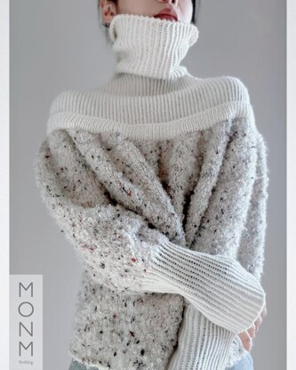Millie sweater is an oversized knitwear that is suitable for wearing underneath a winter coat or show case contrast texture on its own. This casual looking garment features turtleneck collar, feminine twisted ribbing shoulder lines, fluffy bouclé body and long twisted ribbing edges at sleeves. Millie sweater is worked from top down in the round in one piece.