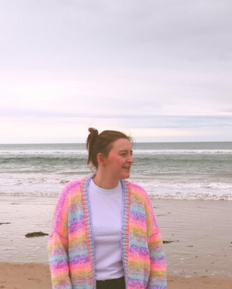 The Mimii Chunky Cardigan is written for sizes XS - 5XL with an intended 25 cm of positive ease for each size. It is knitted using 3 strands of light DK yarn (260 m per 100 g) held triple and uses a simple but effective colour change technique. It is designed to be worn open and oversized. It is the perfect stash buster project!