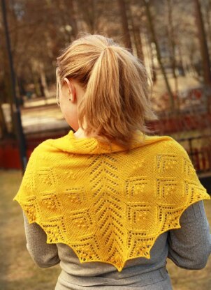 Yellow shawl is knitted in Malabrigo Lace [100% Merino, 470 yd/430m per 50g skein] it used 35 grams knitted on 3.5 mm (US 4) needle