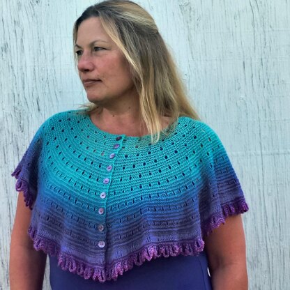 Worked from the neckline down in rows, this relaxing knit will be your favourite “on the go” project. It’s perfect for using up smaller balls of yarn or that one “special” skein. Easy to wear over t-shirts or dresses.