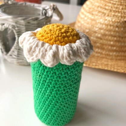 This is a free pattern for a crocheted daisy storage jar using a spice/herb jar, ideal for all kinds of bits and bobs, from your craft room to a girl's bedroom. The flower disc opens like a lid.