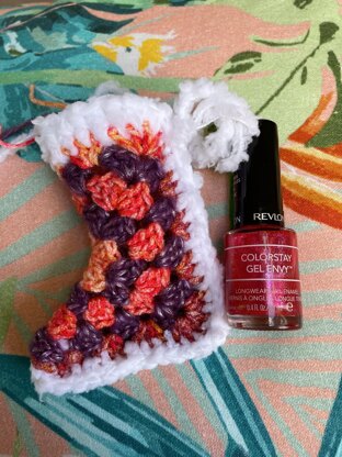 This pattern makes a lovely Christmas tree decoration or gift for loved one, friends or colleagues. A bottle of nail varnish, small tube of hand-cream or fun-size chocolate bar will fit nicely inside for an extra treat for someone special. Alternatively you could make several mini stockings and string them onto a line for decoration or an advent calendar.