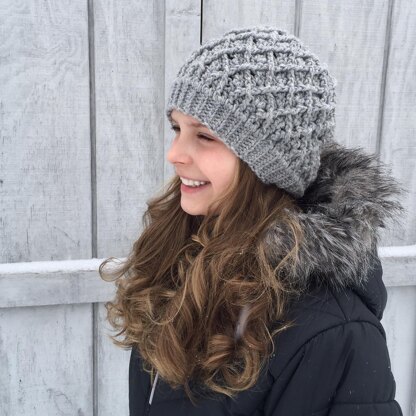 This textured slouch is worked from the bottom up, with a slip stitch ribbing for a knit look. Options are included for a ponytail or messy bun opening (with or without an elastic hair tie).