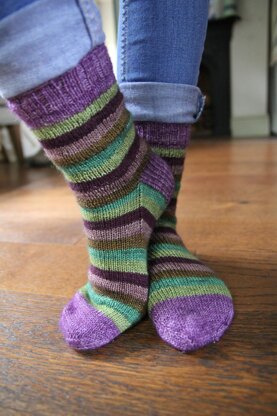 Mini Mania socks are knitted cuff down using mini skeins so that you can get the perfect 5-row stripe repeat. There is a cunning technique which means that although you don't carry yarns along the sock, you still only have six ends to weave in per sock and pretty much jogless stripe sequence!