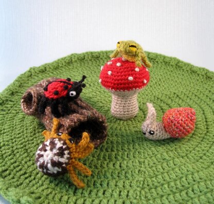 With the patterns in this set you can crochet a selection of mini creatures – spiders, beetles, frogs and snails – along with a toadstool, hollow log and grass mat for them to play on.