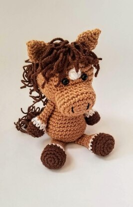 The horse measures approx. 5.5” when sitting and 8.5” when standing. These measurements are when Medium Weight Yarn (4) and a 3 mm hook are used. Any weight yarn and correlating hook size could be substituted as long as all the colors of yarn are the same weight.