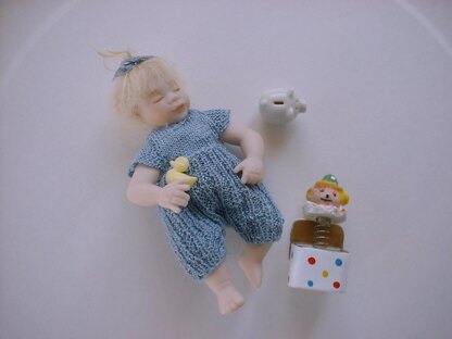 I started this miniature knitting pattern quite a while ago but had to set it aside each time a new commission came up. I think the little romper suit is adorable! It is the first design I've created for this size of baby doll, and it takes longer to knit than you might expect! It is modern, knitted in the one piece and features rib, stocking stitch and garter stitch detailing. The romper closes with 5 miniature buttons on the back.