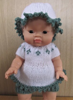 Outfit for the 32cm Minikane doll comprising angel top, sunhat, shorts and shoes. Knitted with DK Paintbox yarn on 3.75mm straight needles. Easy to knit with basic colourwork and a picot edging to the top and the hat. Also uses 4 x 13mm buttons and shirring elastic.