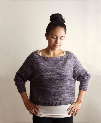 This loose fitting raglan sweater is a great garment to throw on over any top or to simply wear alone. Minimum use of short rows adds a bit of length to the back for a high-low hem. Both sleeves and body are worked from the bottom up. Length can be easily customized and adjusted to your preference.