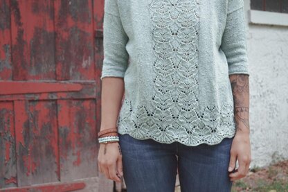 Mint Lotus is a boxy, loose fitting top perfect for mild, transitional months. The lace design depicts the beautiful saying “out of the mud comes the lotus,” reminding us that through the endurance of hard times growth and beauty can sprout. The lace depicts a root and lotus motif along the bottom edge and lotus flowers running up the front. It features a simple drop shoulder, wide boat neckline, and 3/4 fitted sleeves for a flattering fit. This sweater is knit mostly in the round with the exception of the top of the front and back at the armhole openings. Knit up in Yarn On The House Best Friend yarn, a blend of cotton and wool, it is a lightweight, comfortable top with a bohemian, feminine feel.