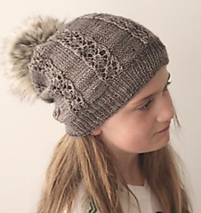 I designed Miranda hat to match the Miranda sweater. It has the same Diamond rib pattern and the same gauge. This pattern also includes a DIY tutorial for the fur pompom you see in the picture. The hat has “row by row” instructions, explained written and by chart.