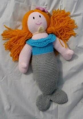 Originally published as 'Marissa Mermaid' this is a cute alternative to the traditional teddy or soft doll. The pattern is knitted using two sizes of needle, which helps to keep the gauges of the two different yarns correct. Knitted mainly in garter stitch and stocking stitch, the shoulder trim uses a variation on the traditional Old Shale pattern, which fits in neatly with the underwater theme, and is echoed in the sea shell necklace and starfish headband details. The main tail, the hair and the head / arms of the mermaid each take less than half a ball of yarn, with the remaining necklace, eyes and starfish taking only an oddment.
