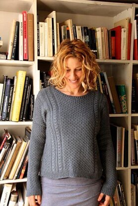 Construction This sweater starts by casting on stitches for the back shoulders and neck. Short rows are worked to shape the top back area and then the knitting continues down to the underarm. Stitches are then picked up from the cast-on edge of the back and the front is worked as a mirror image with neck shaping added in. The fronts and back are then joined at the underarm and the body is worked in the rnd down to the hem. Stitches are picked up around the armholes to work the sleeves.